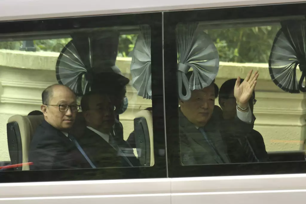 夏寶龍離開柴灣中華基金中學後登車離開,並向傳媒揮手。