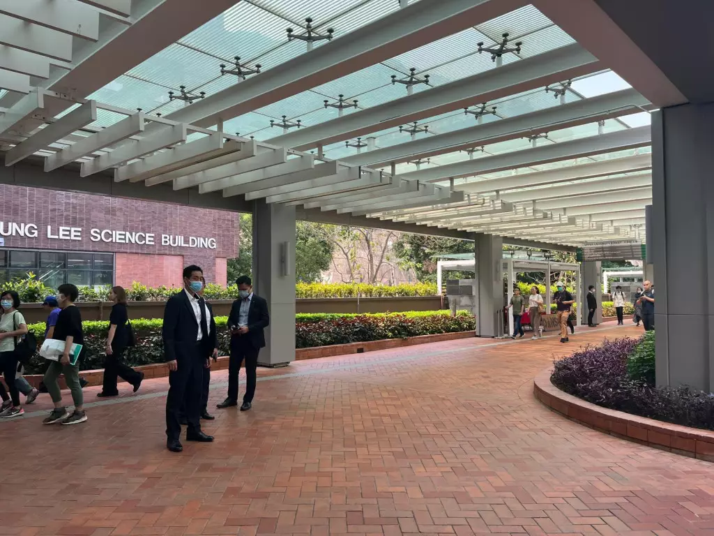 在早上約10時,港大現場有保安及身穿黑色西裝人士巡邏,但守衞未算太森嚴,亦沒有拉起封鎖線或圍板,記者及其他人士仍能自由進出。