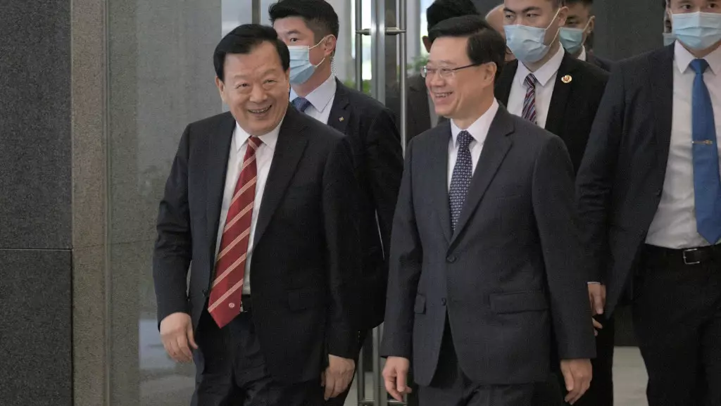港澳辦主任夏寶龍(左)在特首李家超(右)陪同下,在政總與商會人士會面。