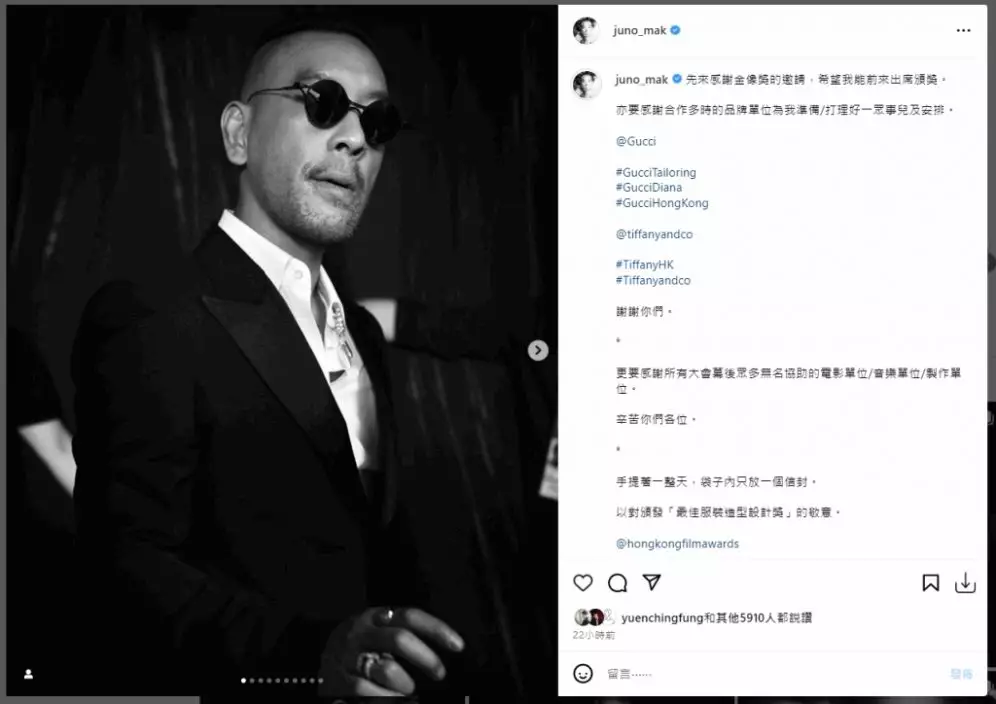 Juno在社交網貼出參加頒獎禮的照片,留言說:「先來感謝金像獎的邀請,希望我能前來出席頒獎。亦要感謝合作多時的品牌單位為我準備/打理好一眾事兒及安排。更要感謝所有大會幕後眾多無名協助的電影單位/音樂單位/製作單位。辛苦你們各位。」之後他解釋拿着Gucci新袋的原因,原來是對獎項的尊重:「手提著一整天,袋子內只放一個信封。以對頒發「最佳服裝造型設計獎」的敬意。」其實當時麥浚龍是在Gucci新袋中拿出信封,不過由於電視直播畫面未有播出,而令網民產生誤會。而麥浚龍所持的手袋為今季Gucci新款,售價為40,500元,他身上的西裝亦為Gucci出品。