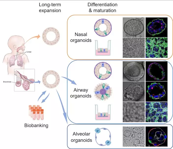 團隊將長期擴增培養的呼吸道類器官誘導分化,建立了成熟的鼻粘膜、氣道和肺泡類器官。
