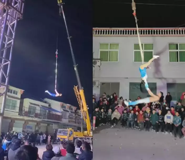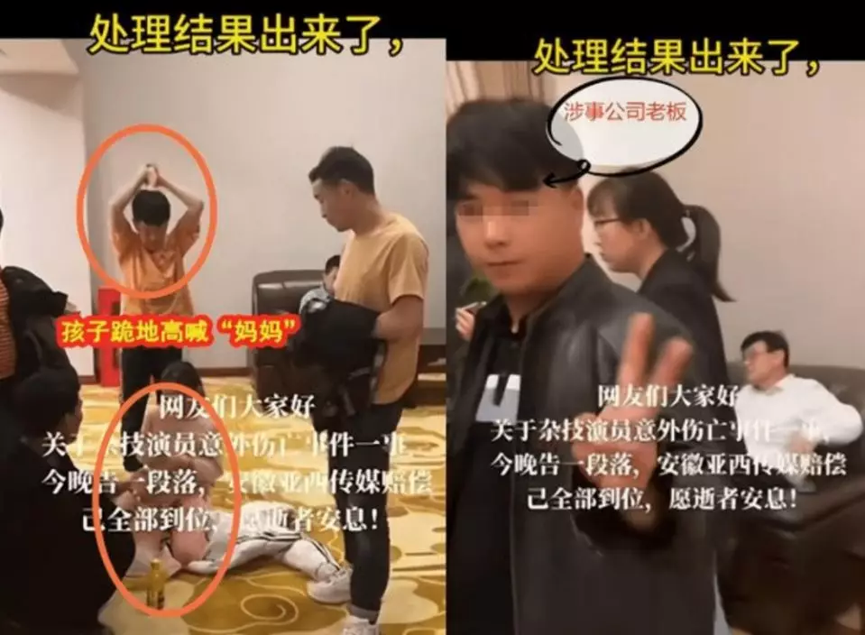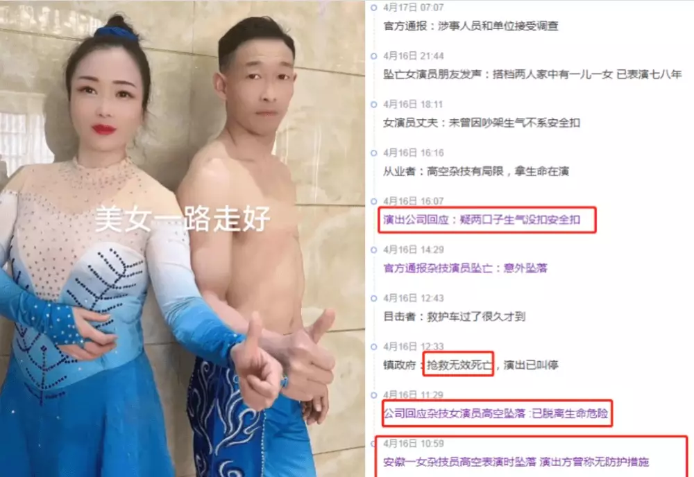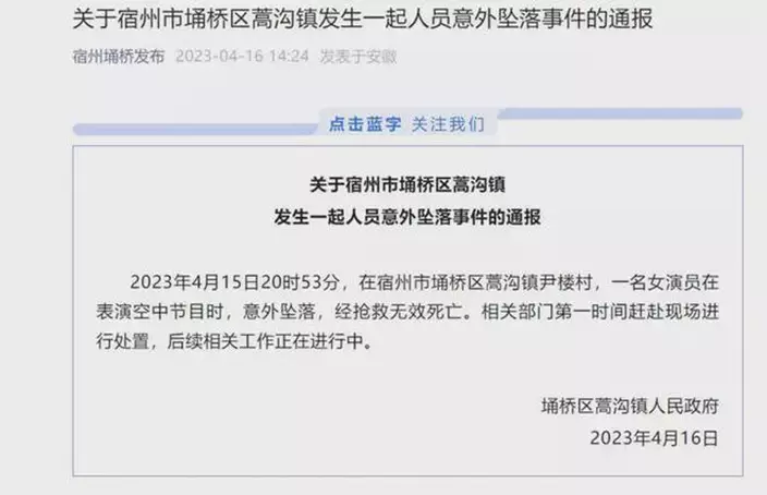 安徽宿州4月15日一場高空表演中,一名女演員墮地身亡事件,引發廣泛關注。一度有傳該對夫婦組合,事前曾吵架,沒扣安全扣。經調查後認定,承辦方安徽亞西演藝傳媒有限公司有違規演出;演出過程中未有提供安全應急防護,違規使用吊車吊人,操作不規範。其後涉事公司已與死者親屬達成以140萬人民幣賠償。