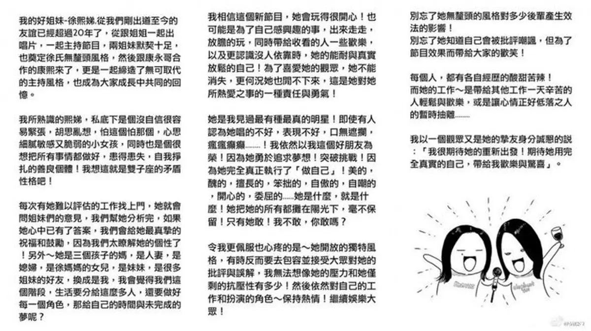 雖然台上自信滿滿,但范曉萱大爆小S私底下沒有自信,很容易緊張、胡思亂想,心思細膩又脆弱,想把所有事情都做好,還會患得患失、自我掙扎的人,同時也很心疼小S,好友的風格有時候面對大眾的批評和誤解,「我無法想像她的壓力和她僅剩的抗壓性有多少!」最佩服對方「依然對自己的工作和扮演的角色保持熱情!繼續娛樂大眾!」她既是好友也是觀眾,最後加上插圖祝福對方重新出發,令網友看了熱淚盈眶,大讚她是「萬年好閨蜜」!