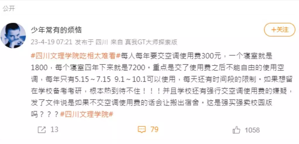 有學生在網上發文指四川文理學院向學生收取冷氣使用費。