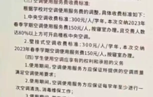 該學生指,四川文理學院收取住宿費後,要求每人每年繳交冷氣使用費300元,一個宿舍房就是1800元,4年下來每個宿舍房的冷氣使用費就是7200元。而繳費之後不能自由使用空調,每年只有5月15日至7月15日,以及9月1日至10月1日可以使用,每天設時間段限制。研究生暑假留校備考時無法使用空調,是熱到待不住。學校還發文件稱如果不交冷氣使用費就搬出有裝冷氣的宿舍,指校方強制學生交錢。