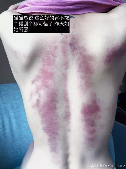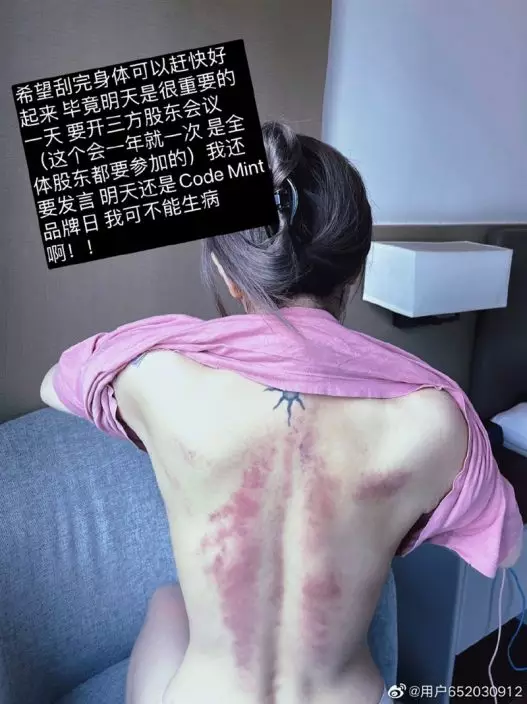 周揚青日前大晒靚靚新相,以及全裸刮痧的照片,她脫去身上的衣服掛在頸上,露出性感美背及纖腰,而其背部卻見到一大遍血紅痕,是刮痧的痕跡。周揚青寫道:「貓貓總說這麼好的背不拔個罐、刮個痧就可惜了,昨天如她所願。」周揚青還晒出穿上細肩帶背心,事業線一覽無遺,但她卻不滿意自己的身材:「最近胖了,因為生病,還腫~」,不少網民見到照片,留言:「這身材哪裡胖了」、「這個背真的很絕」、「又瘦胸又大,讓人羡慕」、「身材爆炸好!!我一個女生都羡慕了,平時有健身嗎」、「這個背太完美了」、「後背這麼瘦,前面那麼肉!」,更有人發現其胸部變得更豐滿:「這個胸是真的假的」、「是胸胖了吧」等。