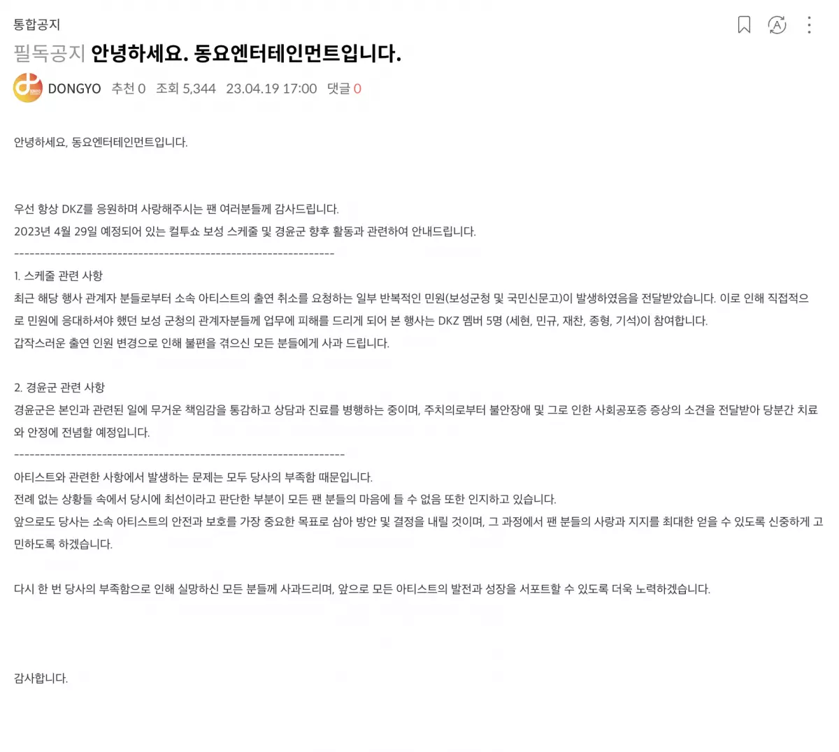 然而在公開剖白後,依然未能平息網民對庚潤的攻擊。時隔約一個月,DKZ的所屬經理人公司東耀娛樂在4月20日發佈消息,表示陷入JMS爭議的庚潤會暫時中斷演藝活動,稱庚潤對與他本人相關的事情深感責任重大,最近在接受心理諮詢和診療時,被診斷出有焦慮症及社交恐懼症的症狀,因此公司決定按照醫生建議讓庚潤暫時中斷活動,集中進行治療和穩定,DKZ暫時會以5人組形式進行活動和出席行程。東耀娛樂亦補充說:「在這種史無前例的情況下,本社認識到當時認為是最佳的判斷,無法讓所有粉絲都滿意。今後也會把保護所屬歌手的安全放在首位,在此過程中為了最大限度地獲得粉絲們的喜愛和支持,將會更慎重地進行反思。」