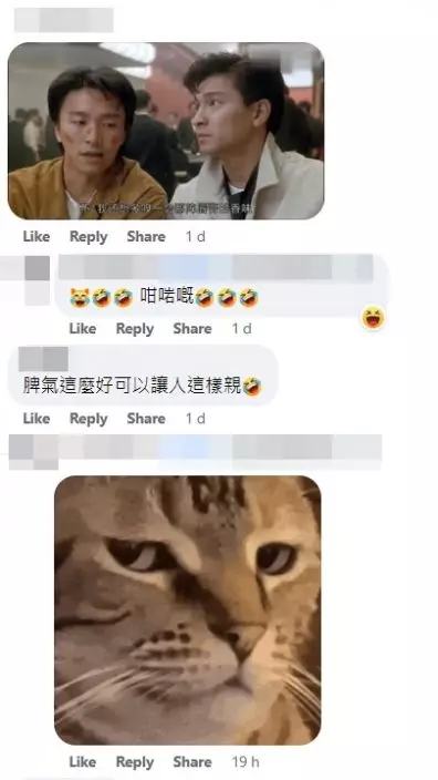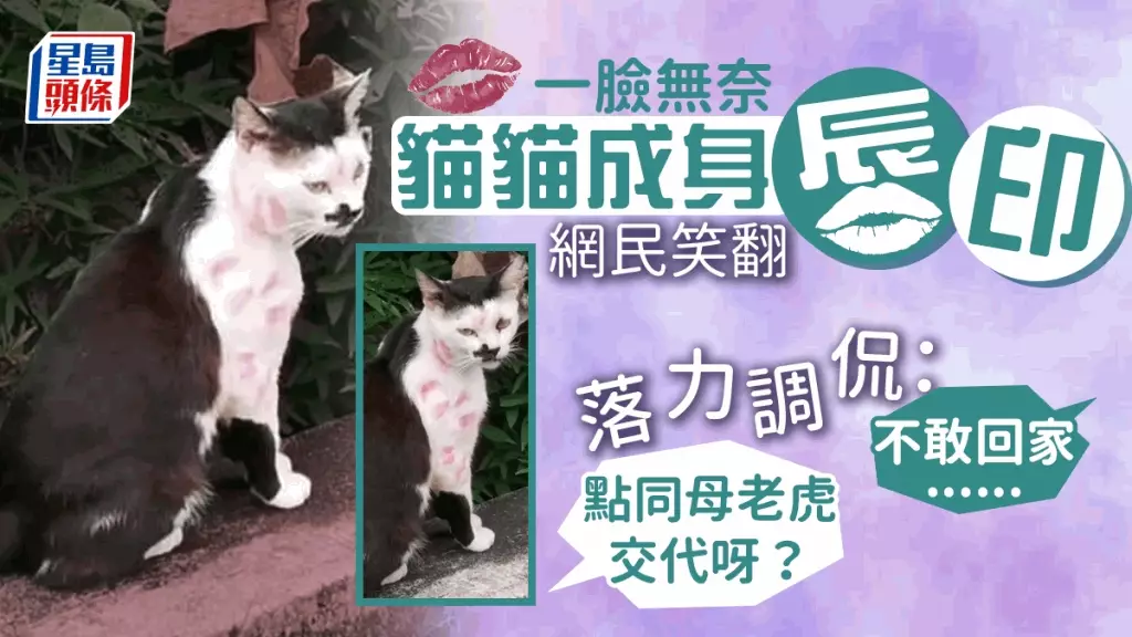 有網民更找來周星馳滿臉唇印的相片與貓咪對比一番;另有人以男性受害者角度出發,指「係咪任錫唔嬲先會變成咁㗎」、「不敢回家......母老虎在」、「貓貓回家怎麼交代呀」、「快給牠洗白白啦」。
