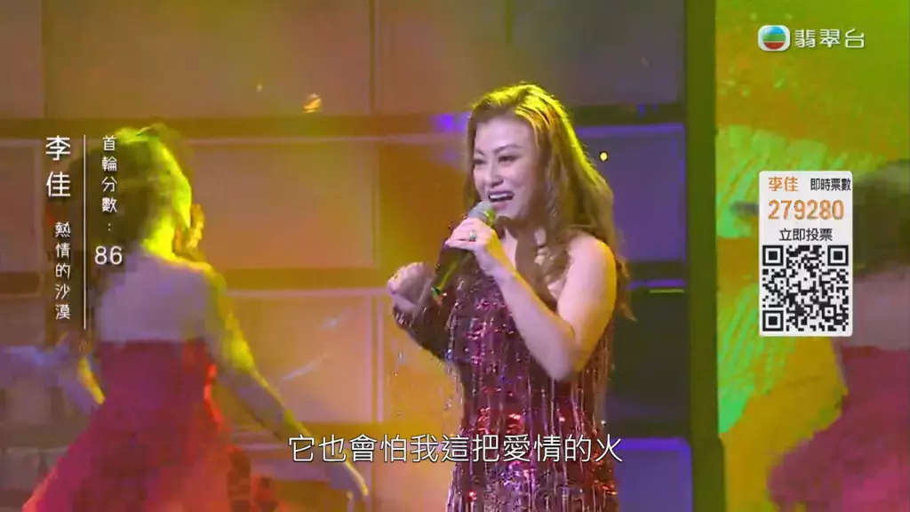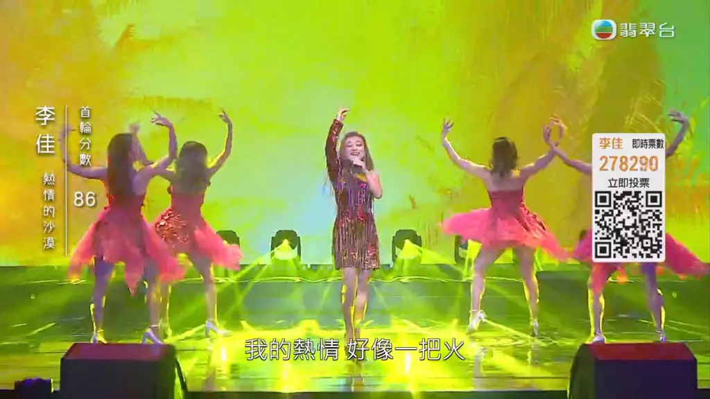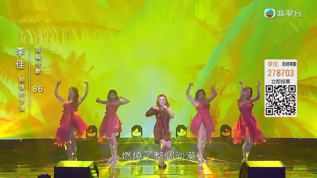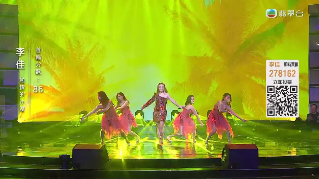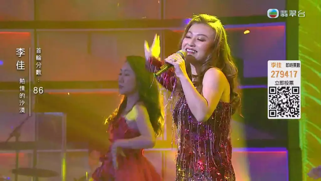 《中年好聲音》4月23日舉行決賽《中年好聲音登峯之戰》,首回合慢歌演唱《明日話今天》的李佳獲評審激讚,表現理想!而快歌環節她選唱了《熱情的沙漠》,更特意排舞晒舞技。