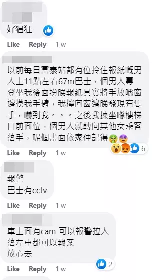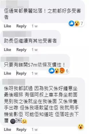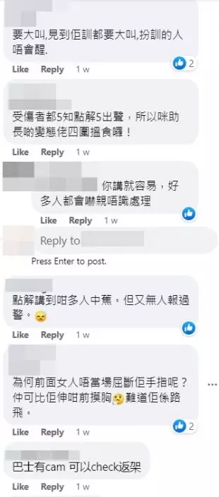 另有網民批評「受害者都唔知點解唔出聲,所以咪助長啲變態佬四圍搵食囉!」,回應的則平心而論「你講就容易,好多人都會嚇親唔識處理。」