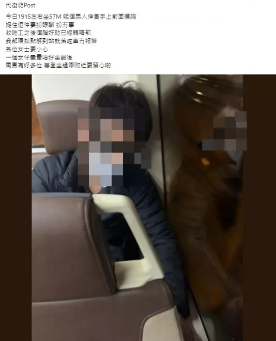 樓主代街坊貼相發帖,相中見到一名坐後排左邊的黑衣男乘客,沿窗邊伸長左手。帖文指事發於4月15日晚上7時15分左右,「坐57M呢個男人伸隻手上前面摸胸,捉住佢仲要扮眼瞓、扮冇事。收咗工之後個腦好攰已經轉唔郁,我都唔知點解到站就落咗車冇報警。各位女士要小心,一個女仔盡量唔好坐最後,周圍有好多位,專登坐過嚟附近要留心啲。」