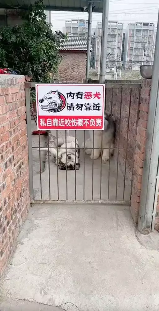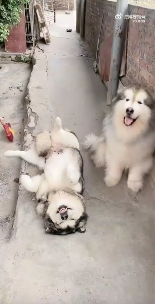 影片中可見,一戶人家的門口掛着一塊告示牌,上面寫着「內有惡犬 請勿靠近 私自靠近咬傷概不負責」,似乎門內真的有可能會傷人的惡犬!不過走近一看,卻見到兩隻肥嘟嘟又毛茸茸的阿拉斯加雪橇犬,一隻四腳朝天躺着、瞇起雙眼並露出傻傻的笑容,任由正在掃地女主人拉着牠的後腳移動,毫不反抗;而另一隻則呆呆的坐在旁邊,同樣露出可愛的傻笑,兩隻狗狗與印象中「惡犬」的模樣完全相反!