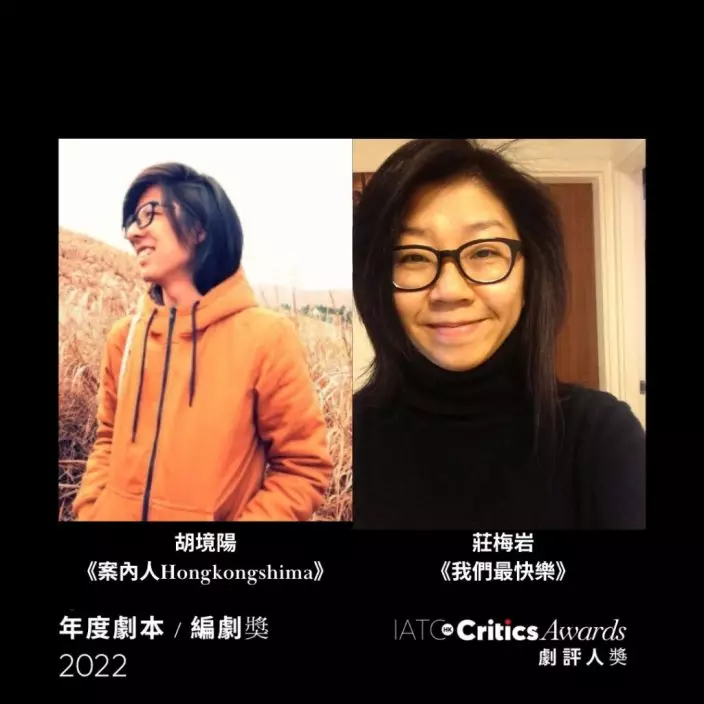 今年年度劇本/編劇獎出現「雙獎」,除了莊梅岩,編劇胡境陽憑前進進戲劇工作坊《案內人Hongkongshima》獲頒「IATC(HK) 劇評人獎」的年度劇本/編劇獎,胡境陽已是第二度獲此殊榮,他的劇本通過合適的藝術處理去梳理個人情感,值得表揚。