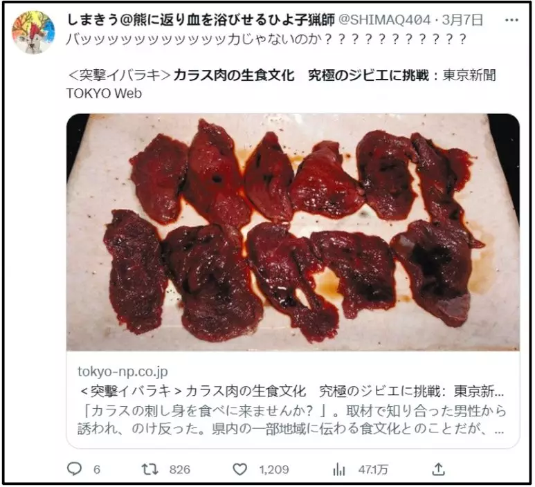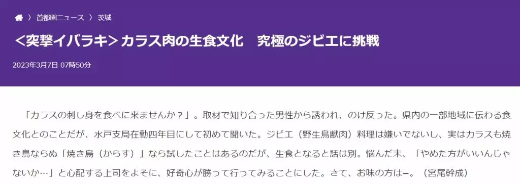 日本東京新聞網刊登了一篇名為《烏鴉肉的生食文化——挑戰野味的極限》的報道,有東京新聞記者,在該文章中提及,有人邀請記者到日本茨城縣常陸那珂市參加烏鴉刺身品鑒會,在幾個當地居民家中品嚐了烏鴉刺身,並介紹體驗了一些地區的飲食文化。
