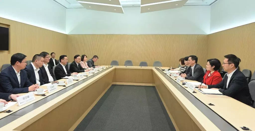 楊潤雄與貴州省委常委、省委宣傳部部長盧雍政(左四)和代表團會面。旅遊事務專員沈鳳君(右四)及文化體育及旅遊局副秘書長郭黃穎琦(右二)亦有出席。政府新聞處圖片