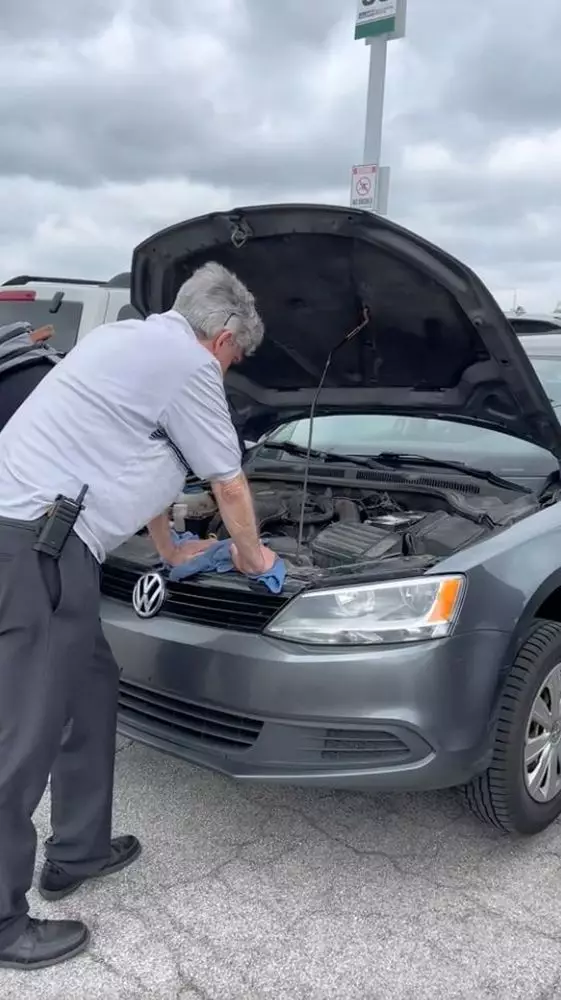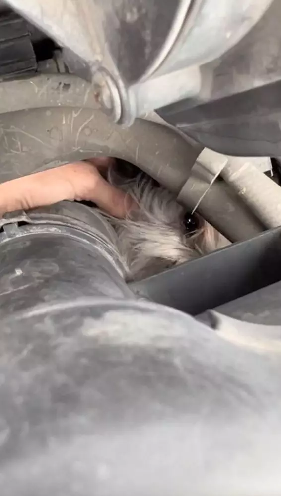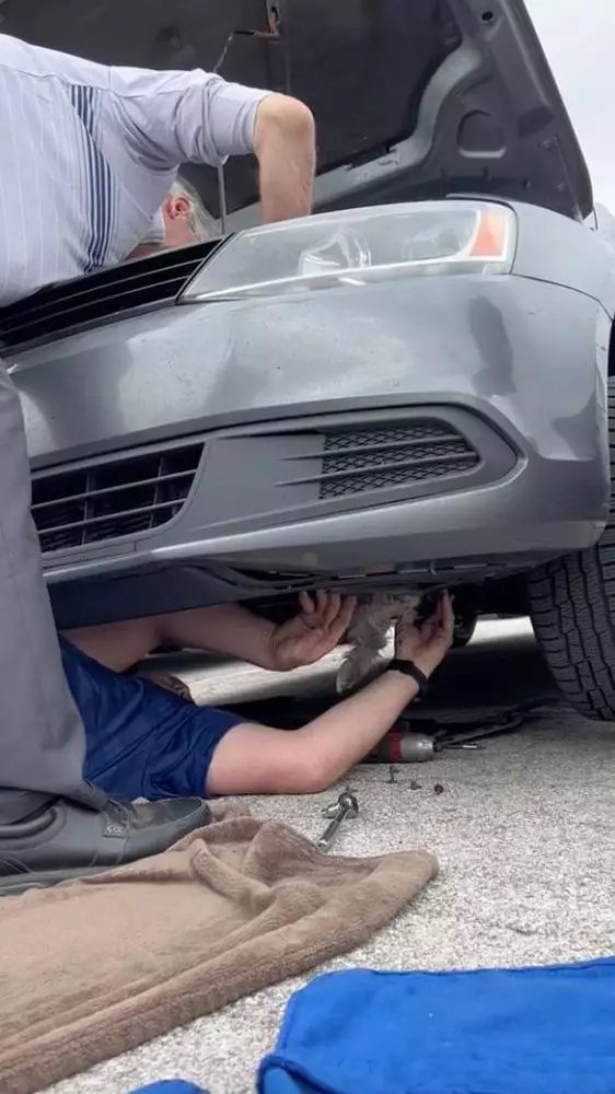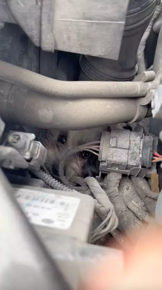 Carrie Gillaspie在社交平台分享影片,指當日她正去到考夫曼體育館(Kauffman Stadium)準備工作,在停車場泊好車後,聽到一陣陣的狗哭聲,沿着哭聲尋找,發現是從一輛私家車中傳出。Carrie馬上根據車上的聯繫方式通主車主Ashley Newman,Ashley到場後打開車的引擎蓋,發現一隻約四個月大的小狗正藏在眾多的零件底下,表情看上去十分無助。