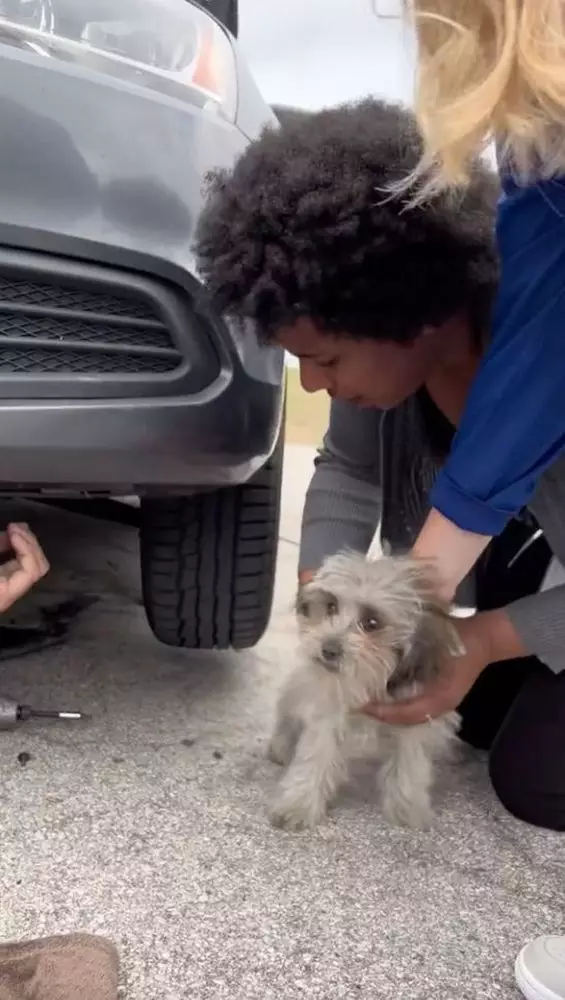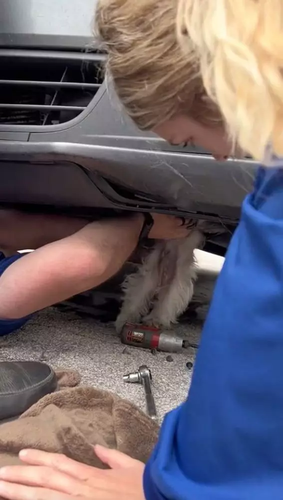 Carrie和Ashley嘗試過各種方法,甚至趴在地上鑽進車底,但都未能成功救出小狗,只能摸摸牠安撫牠。後來,二人到體育館求助,並成功得到當日其中一隊球隊的機械技術員Dennis Miller幫助,小狗終於成功脫困。