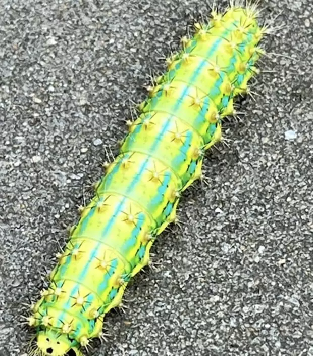 毛毛蟲身上有長形花紋,熒光與綠色相間,並帶有如仙人掌一般的刺針。
