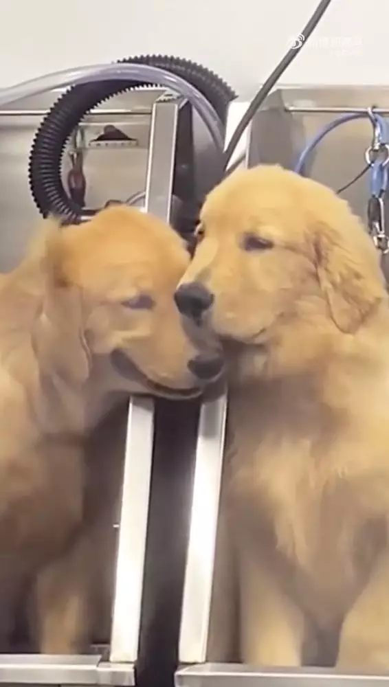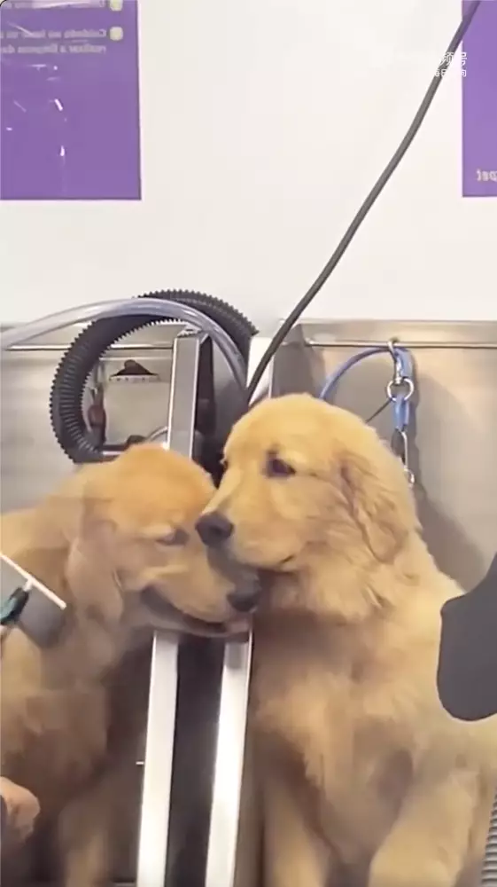 影片中可見,兩隻金毛尋回犬被主人送到寵物美容院洗澡,兩隻狗狗待在相鄰的洗澡池中,當時已經洗完澡,面前各自美容師正在為牠們吹毛,但牠們的表情好像受了什麼天大的委屈,還將頭依靠在一起互相安慰,令看過的網民都忍不住爆笑!