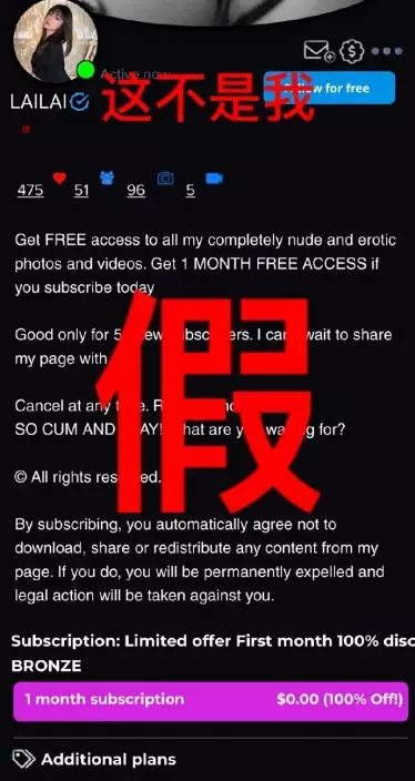 「Caro賴賴」申訴不法份子以會員制販賣虛假合成的色情影像。