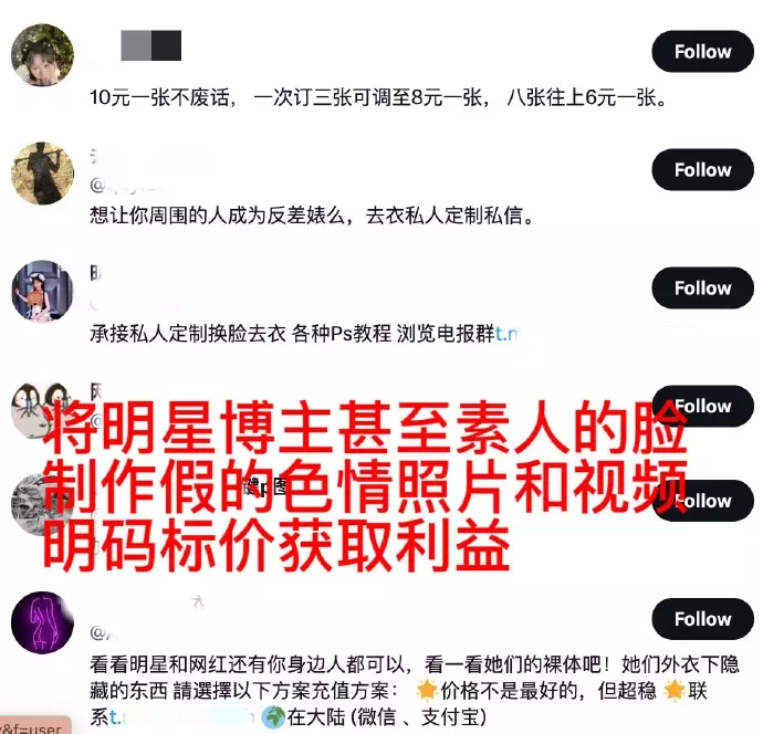 據悉,「AI盜臉」影片逐漸形成一條產業鏈,產業鏈的一端是不法分子通過AI換臉技術賺錢。這些不法分子,將明星、博主(網紅)甚至普通人的臉製作成色情照片或影片,明碼標價獲取利益,甚至可以私人定制。