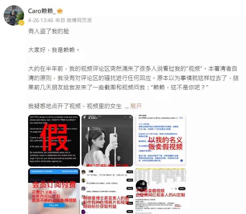 「Caro賴賴」申訴不法份子將明星博主(網紅)甚至普通人的臉製作成色情影像。