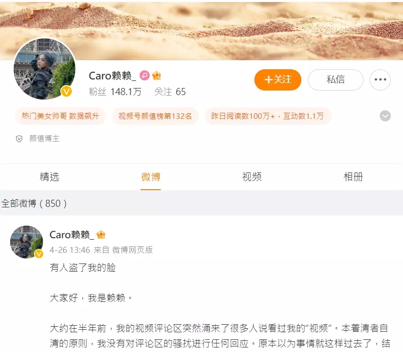 內地女網紅「Caro賴賴」發文申訴被盜臉製作AV影片。