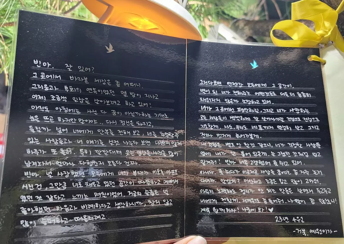 此外,與文彬為「98Line」好友的VIVIZ成員Umji(嚴智),在粉絲們設立的悼念區也寫下親筆信給文彬,「度過了幾個充滿思念和後悔的夜晚,現在準備一點點回到日常!雖然每天早上仍抱着是一場夢的期待睜開眼⋯⋯我們留下了很多充滿歡笑的影片和照片,真的很慶幸。」她又提到:「希望你在那邊平安,真心祈禱你所愛的每個人都能勇敢地好好生活。我們會連你的那份一起努力生活,非常帥氣地老去!」