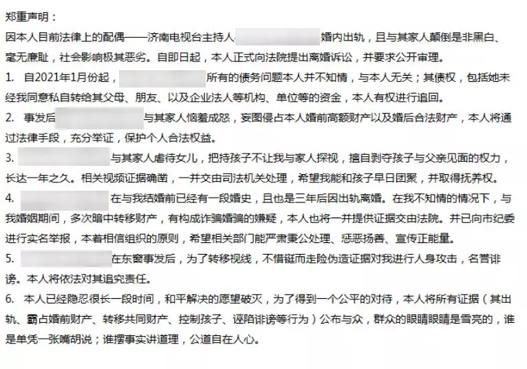 微博更流傳疑似是該名女主播的丈夫2021年發表的聲明,內容指其太太在跟他結婚前已有過一段婚姻,他指控該名女主播出軌致婚姻破裂,他單方面提出離婚。他更指女主播不讓他見女兒,更聲稱女主播及其家人虐待女兒,文中亦透露她疑有債務在身。