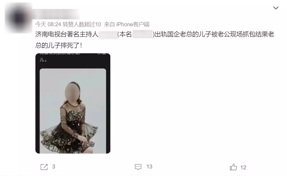 據內地網民爆料,該名女主播去年被爆出軌國企太子爺,當日其丈夫有計劃上門捉姦,突然到訪妻子身處的單位,國企太子爺為避捉姦爬出窗外而意外身亡,更有指該名女主播曾被包養。據指內地傳媒報導,女主播的丈夫於濟南一所小學任職教師,而女主播同時亦是一位著名播音員,形象非常正面,因此偷食事件曝光後令不少人驚訝。