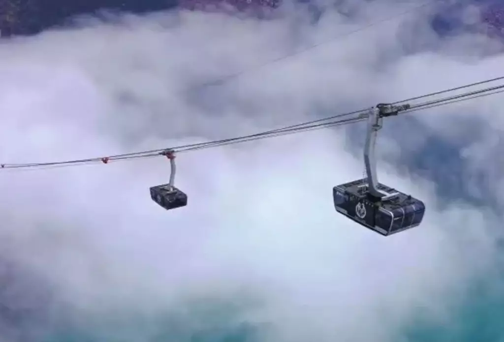 據悉該纜車吊廂是目前國內承載量和運量最大的往複式空中巴士,索道全長1,100米,落差334米,最多可承載近200人。