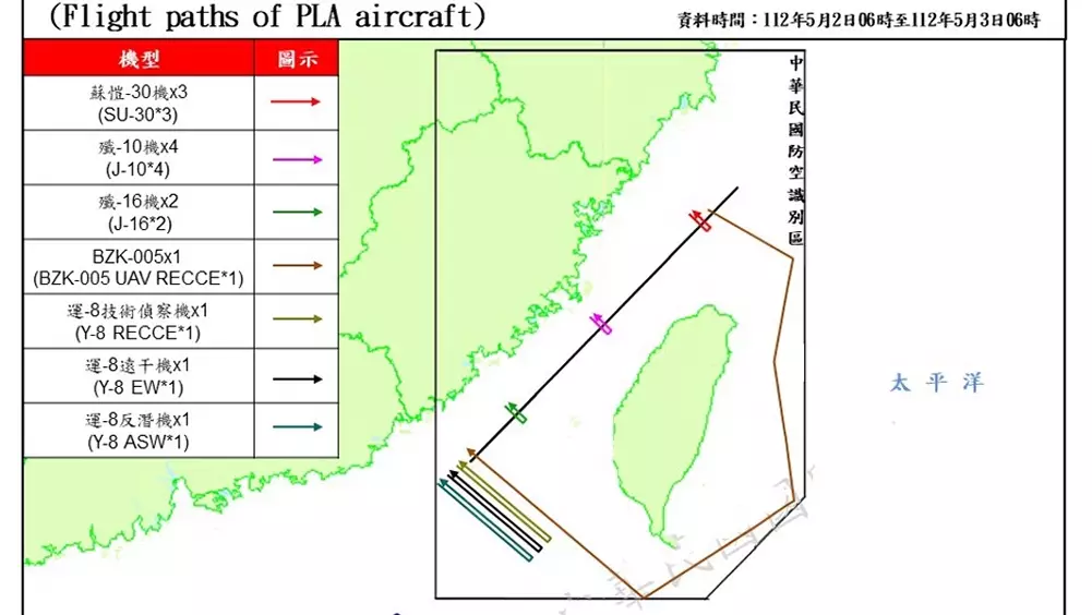 據台媒報道,台灣的防務部門5月3日發表新聞表示,截至清晨6時的24小時內,共偵獲27架次解放軍軍機,7艘次艦艇於台灣島周邊海空域活動,其中有13架次進入西南、東南及東北空域,其中包括一架BZK-005長程無人偵察機,從北方空域近入後,一路順時鐘方向繞台一圈,是繼4月底TB-001型無人機以來,第二度有無人機繞台一圈。台運用任務機、艦及岸置飛彈系統全程嚴密監控。