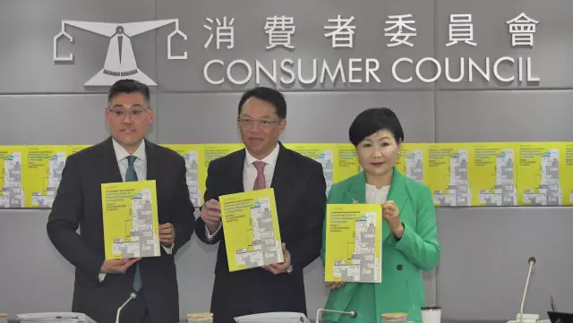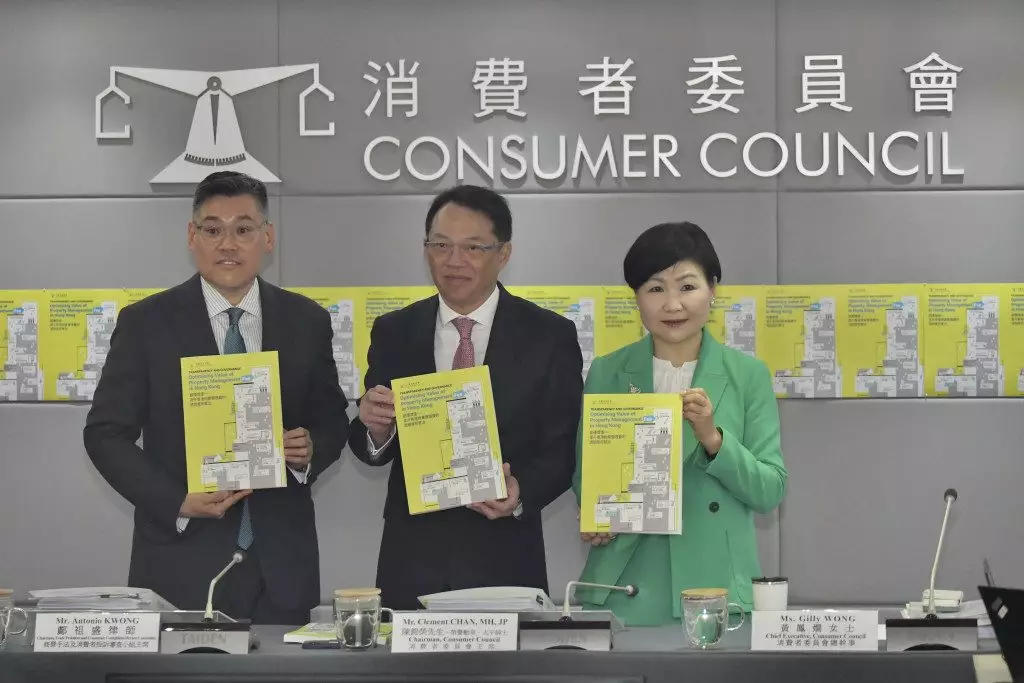 消委會記者會,公布有關香港私人住宅管理費的研究報告(左起:商營手法研究及消費者投訴審查小組主席鄺祖盛、消委會主席陳錦榮、消委會總幹事黃鳳嫺)。