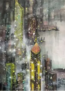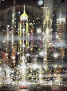 「都市水墨」的開拓先驅王秋童,嶄新的現代筆墨語言既參透着文人畫的典雅,又不失西洋畫即席揮毫速畫的灑脫。他善於運用迅疾筆法、水墨設色等技法營造激情澎湃的畫面,火樹銀花的夜景讓人回想兒時聖誕節拆禮物那種按捺不住的喜悅。王秋童喜以潑墨手法作提亮點——光影在畫紙上猶如在玩追逐遊戲,偶爾光點點綴高樓一隅、有時則一朵朵煙花在黑夜中綻放耀眼繁光,晶亮的眸子唱着這城市的歌謠。