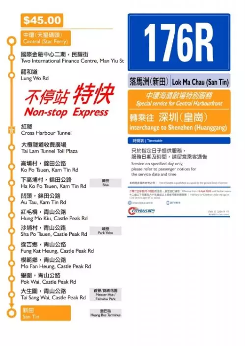 城巴將提供2條路線,包括176R和A11R,分別前往落馬洲(新田皇巴站)及香港國際機場,車費皆為45元。城巴