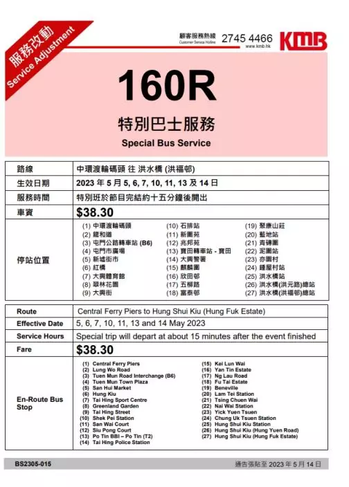 九巴亦會提供3條特別路線服務,包括160R(往洪水橋洪福邨)、168R(往元朗西),178R(往粉嶺 (聯和墟)),車費分別為38.3和43.3元。