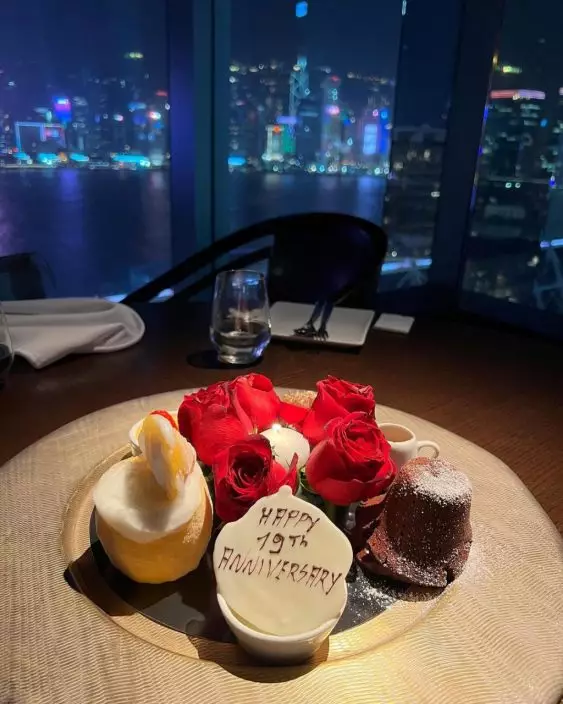 維港夜景前合照,枱上甜品更有數朵玫瑰花,非常浪漫。