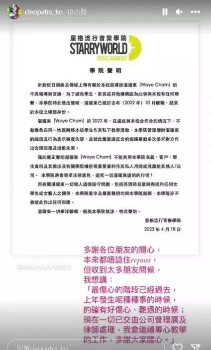 歌唱學校亦為了事件發表聲明「割席」。