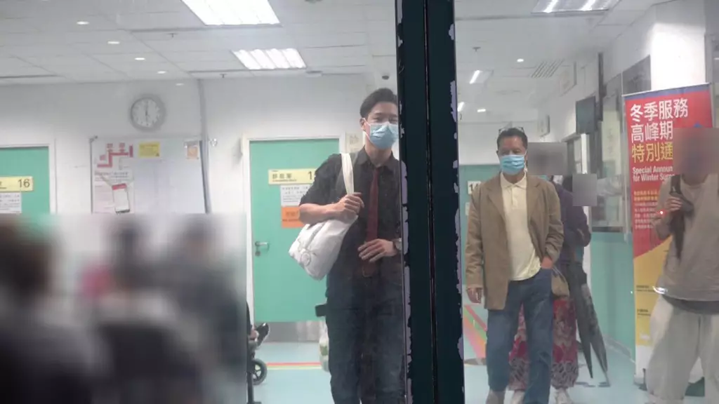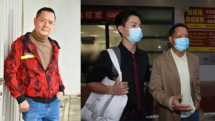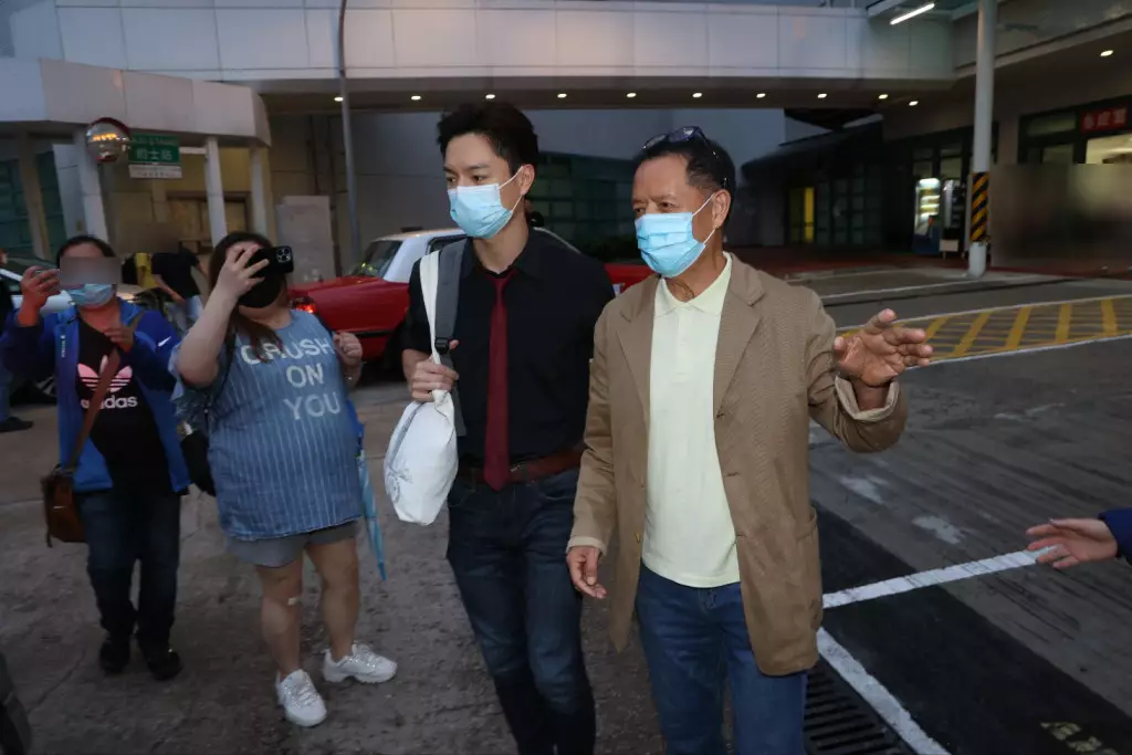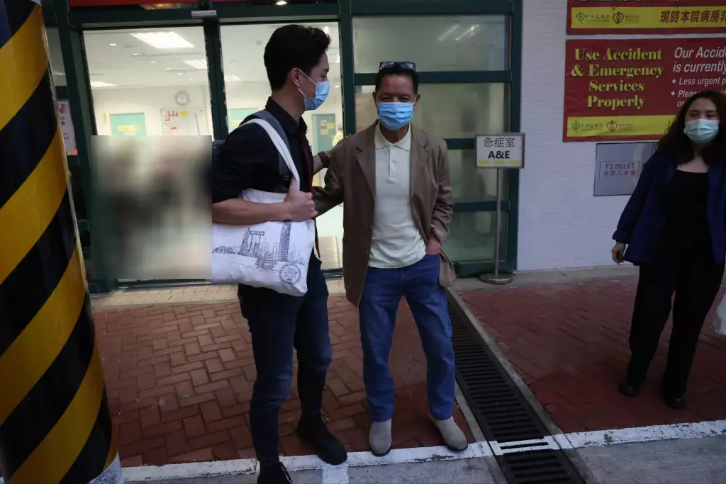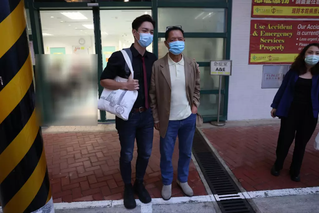 吳偉豪陪同爸爸留步合照,一家三口跟經理人步出醫院。
