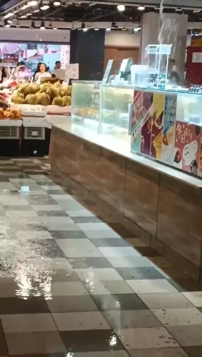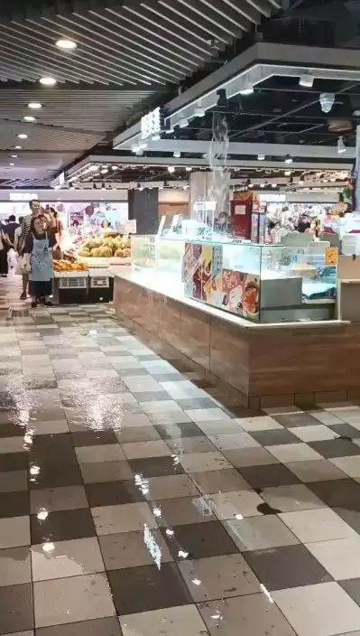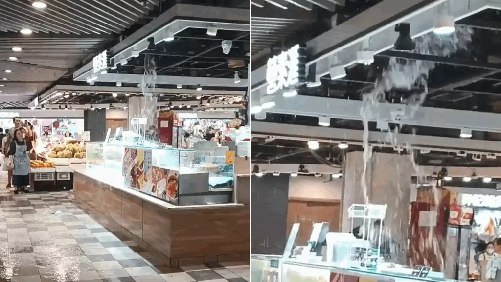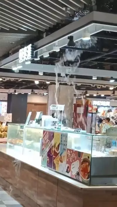 天文台7日發出今年首個紅雨暴雨警告,部份地區有驟雨及強烈狂風雷暴,大圍顯徑商場地下街市更上演「水舞間」!有網民指大圍顯徑商場地下街市的天花不斷漏水,水流由天花板的冷氣機槽位漏出,燈光位置亦有不少水柱噴水,猶如瀑布一樣。