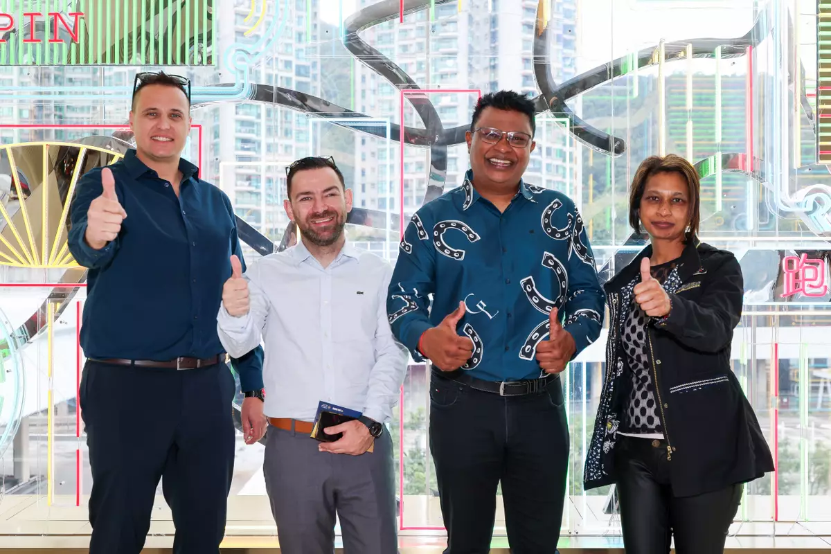 南非旅客Kuben Gengan(右二)跟朋友一樣熱愛賽馬,他曾到訪六大洲觀看賽馬賽事。今年10月見證「嘉應高昇」以精湛表現攻下澳洲的「珠穆朗瑪峰錦標」後,決心一定要來港欣賞這匹世界短途王者在港出戰。香港賽馬會圖片