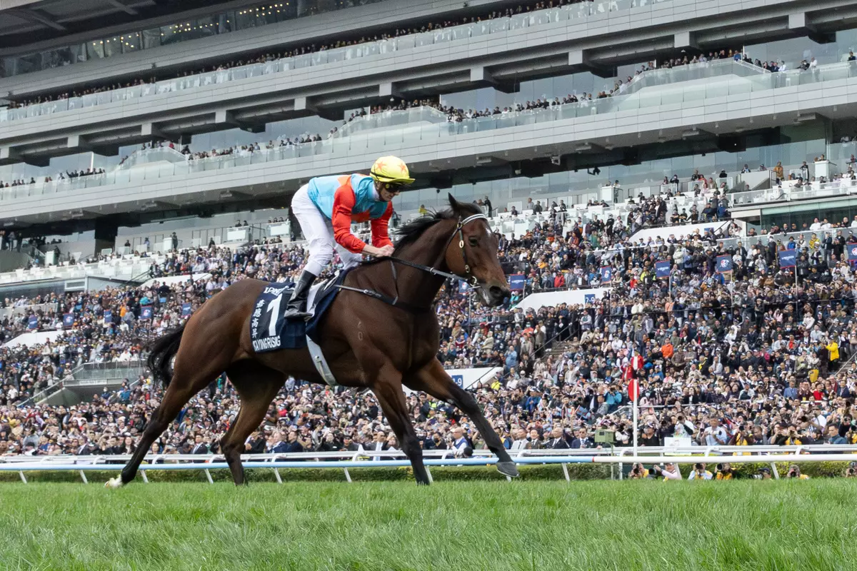 備受海外及本地馬迷關注的全球最高評分短途賽駒「嘉應高昇」,以壓倒性姿態擊敗一眾對手,取得了跨季十六連捷,平了傳奇香港馬王「金鎗六十」的紀錄。香港賽馬會圖片