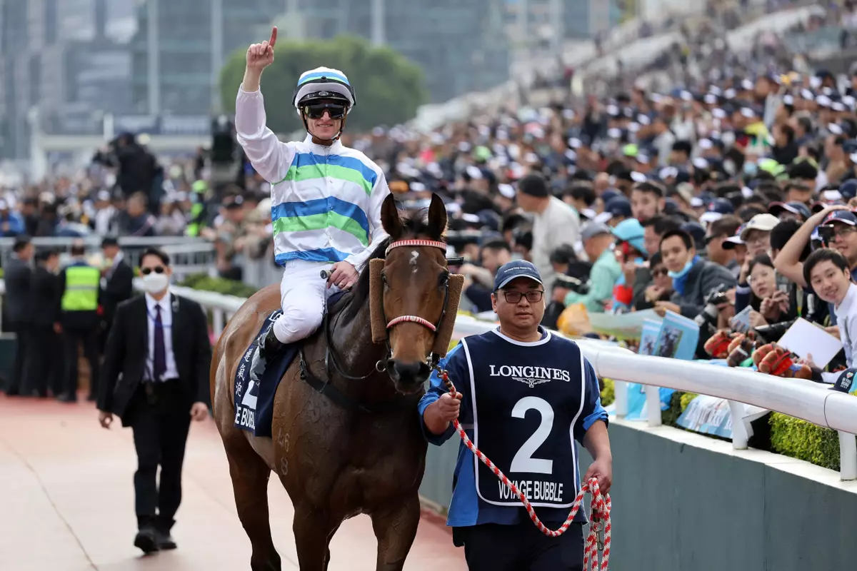 上屆香港三冠王「遨遊氣泡」在八屆香港冠軍騎師潘頓胯下,成功蟬聯一級賽浪琴香港一哩錦標。香港賽馬會圖片