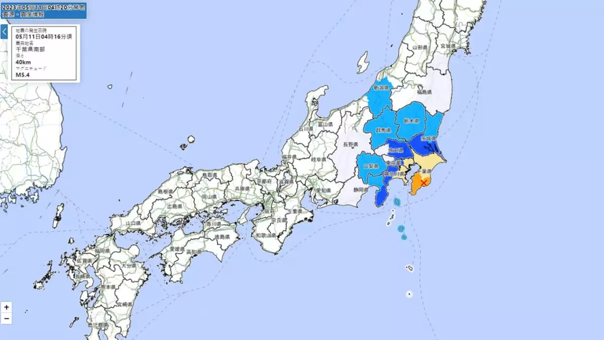 日本放送協會(NHK)報道,最大5級震度在千葉縣木更津市發生,鄰近的東京23區及橫濱市也被觀測到震度4級的明顯搖晃。