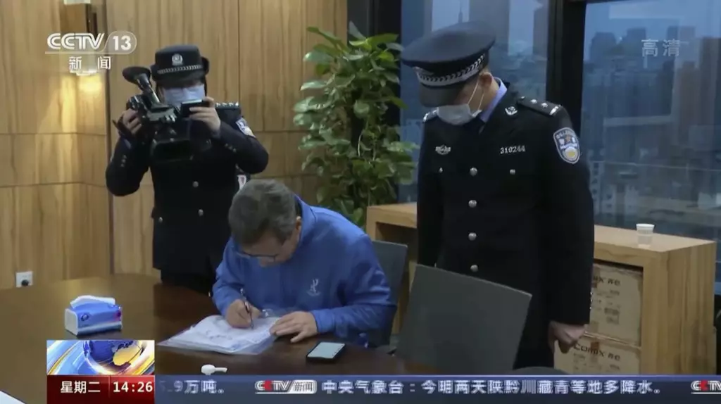 警方在突擊搜查凱盛上海辦公室期間開展執法工作。央視截圖