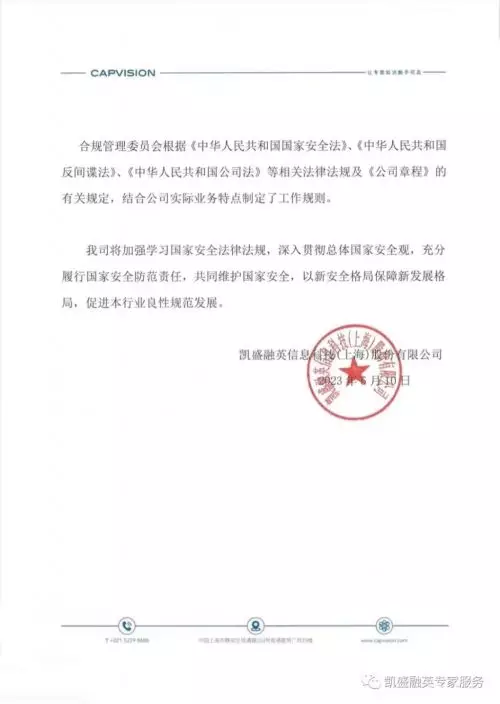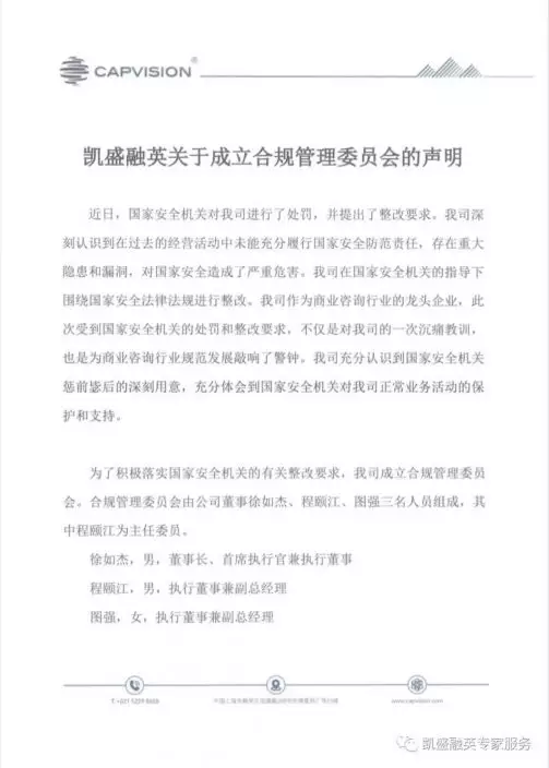 國際專業諮詢公司凱盛融英(Capvision)最近遭北京當局突擊搜查,凱盛融英10日表示,這種情況為該國的商業諮詢業敲響「警鐘」,將成立合規管理委員會,積極落實國家安全機關的有關整改要求。