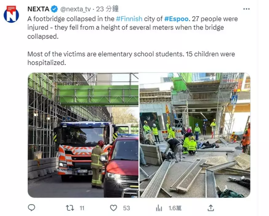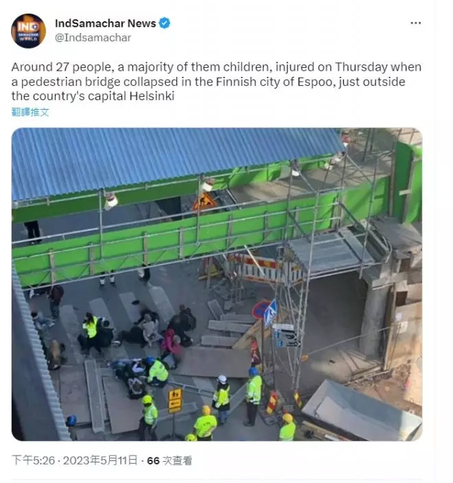 全球「最幸福國度」芬蘭,周四(5月10日)傳出天橋崩塌的事故,地點在首都赫爾辛基西鄰城市埃斯波(Espoo),赫爾辛基地區急救服務單位發言人說,大約27人受傷,多數為兒童。