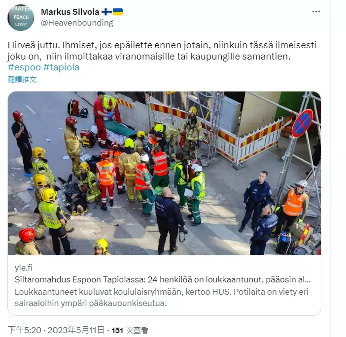 事發時間為當地時間周四(5月10日)上午。芬蘭媒體發表的畫面顯示,至少有5人倒地不起。