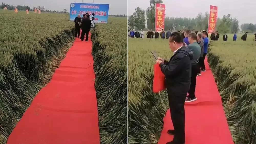 從網上發布的影片顯示,活動現場在麥田中央鋪設了長長的紅地氈,很多人踏著紅地氈觀摩,兩側快成熟的麥子明顯被壓彎了。麥田中立著「永豐103小麥新品種觀摩會」的牌子,麥田到處都插了飄揚的旗幟。
