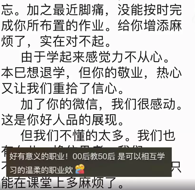 作為學校裡唯一一個00後老師,閔樂不僅有耐心並且很熱情,上課風格有趣,在課後還經常解答學生的問題,大受大家的歡迎,她透露有位最令她印象深刻的學生,對方是一位75歲的婆婆,因身體不適而缺課,特意寫了一大篇文字向閔樂致謝,還擔心自己影響了其他同學的進度,每個字都看出婆婆的用心,就連標點符號都一個沒落下。